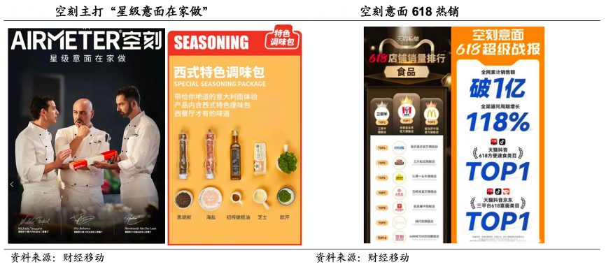 經典案例:根據財經移動、國海證券研究所等綜合資訊表明,空刻意面成立于 2019 年,它在國內率先提出了“速食意面”的概念,以“星級意面在家做”為品牌定位。進入 2022 年,618 大促期間全渠道銷售額破億。不僅在天貓、抖音雙平臺登頂方便速食榜單 TOP 1,而且躋身抖音糧油副食大類目品牌榜單 TOP1 和天貓食品大類目榜單TOP10。