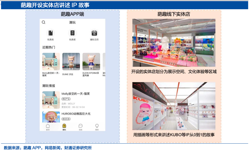 經典案例:根據葩趣APP、網易新聞、財通證券研究所等綜合資訊表明,葩趣于 2022 年 1 月 在上海徐匯美羅城開設葩趣旗艦店,在滿足新銳 IP 商品展示的需求基礎上,葩趣希望通過展覽的形式,讓 IP 在早期便和消費者互動,增加 IP 的曝光后再依托 泡泡瑪特的供應鏈,打造 IP 衍生品,最后在葩趣線下門店、小程序以及天貓旗艦店等渠道售賣,實現展覽和零售的結合,建立完整的 IP 打造鏈條。