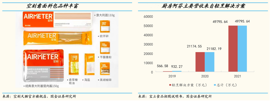 經典案例:根據空刻天貓官方旗艦店、寶立食品招股說明書、國金證券研究所等綜合資訊表明,寶立食品公司早期是廚房阿芬的調料包供應商,與廚房阿芬合作關系緊密。2019年11月,廚房阿芬推出新品空刻意面,其中的輕烹料理醬包、歐芹撒粉和蒜香油包均為其提供。2021年廚房阿芬專注輕烹解決方案,其中空刻意面銷量爆發式增長,推動收入翻倍增長至 5 億元。