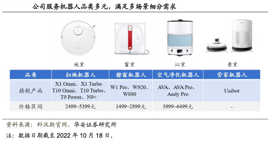 經典案例:根據科沃斯京東自營旗艦店、華安證券研究所等綜合資訊表明,科沃斯公司掃地機器人主要在售產品包括一點的 K 系列和科沃斯的 T 系列、N 系列和 X 系 列,價格段從 799-5399 元不等,技術方面,公司產品力持續領先,是市 場上為數不多地同時擁有 LDS SLAM 和 VSLAM 全局規劃產品的領先企業,公司產品的 導航方式涵蓋了市面上主流前沿技術,包括 D-ToF 激光導航、AIVI 視覺導航和 3D 結構 光導航,可實現掃地、拖地、自清潔、自集塵等多種功能,持續為用戶創造價值增量。