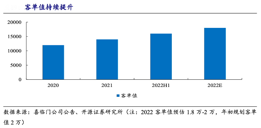 經(jīng)典案例:根據(jù)喜臨門公司公告、開福證券研究所等綜合資訊表明,喜臨門緊抓消費(fèi)者一站式購(gòu)物核心需求,強(qiáng)化培育套系化銷售體系,利用性價(jià)比優(yōu)勢(shì)強(qiáng)力引流,進(jìn)而持續(xù)提升客單值。2020年至今其客單值穩(wěn)步提升,從12000元增至 16000 元,預(yù)計(jì) 2022 年全年客單值為 1.8~2 萬元。