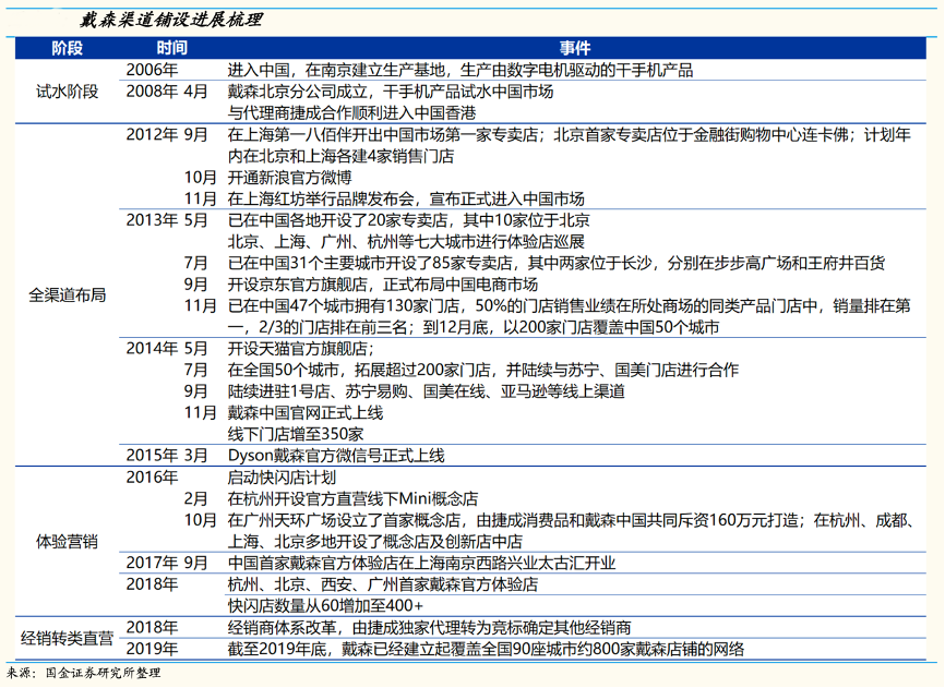 經(jīng)典案例:根據(jù)市場(chǎng)公開資料、國(guó)金證券研究所等綜合資訊表明,戴森中國(guó)線上:線下渠道收入比例約為1:1,其渠道鋪設(shè)進(jìn)展,并將其劃分為 4 個(gè)階段:試水階段、全渠道布局、轉(zhuǎn)型體驗(yàn)營(yíng)銷、經(jīng)銷商改革。伴隨門店數(shù)量持續(xù)擴(kuò)張,截至 2019 年底,戴森已經(jīng)建立起覆蓋全國(guó)90座城市約 800 家戴森店鋪的網(wǎng)絡(luò)。