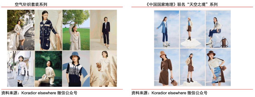 經典案例:根據Koradior elsewhere微信公眾號、中信證券研究部等綜合資訊 表明,2021年珂思空氣針織套裝將“針織梭織化”,打破對針織款式的刻板印象,提升面料的光澤感和挺闊度。聯名《中國國家地理》,傳達自然舒適理念。2021 年珂思從《中國國家地理》收錄的 風光圖譜汲取靈感,以抽象的藝術手法將自然之韻榮譽時裝設計,獲得西藏扎布耶茶卡鹽 湖、新疆伊犁霍城縣薩爾布拉克鎮、內蒙古黃崗梁圖鑒授權,分別推出“天空之境”“絕美伊犁”“膠囊系列—共生”三大聯名系列,傳達品牌敬畏自然,堅持可持續時尚的理念。