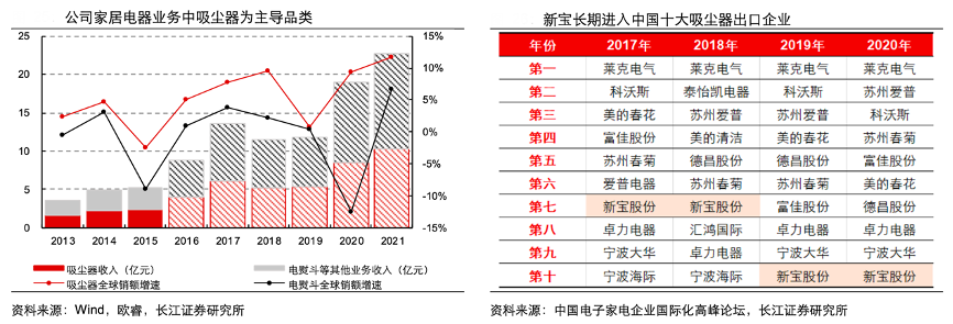 經典案例:根據wind、歐睿、中國電子家電企業國際化高峰論壇、長江證券研究所等綜合資訊表明,新寶公司經營中,吸塵器在公司家居電器業務中占主導地位,2013-2015年,吸塵器在家居電器業務中的占比穩定在45%,電熨斗等其他品類占比穩定在55%;考慮到家居電器主要以外銷為主,且近年來吸塵器海外增速持續優于電熨斗表現,預計吸塵器業務占比仍在穩步提升,2017-2020 年間公司連續進入中國十大吸塵器出口企業榜單。