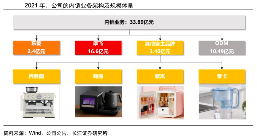 經典案例:根據wind、公司公告、長江證券研究所等綜合資訊表明,新寶內銷已形成多品牌經營矩陣,子品牌共用新寶研發、生產平臺,營銷層面各自推廣。其中,關注度最高且表現最為亮眼的當屬“摩飛”,成就了 2017 年確立代 理至 2021 年收入達到 16.6 億的成長奇跡;其次,東菱作為早期成立的子品牌,經多年 發展,2021 年收入規模達到 2.4 億。