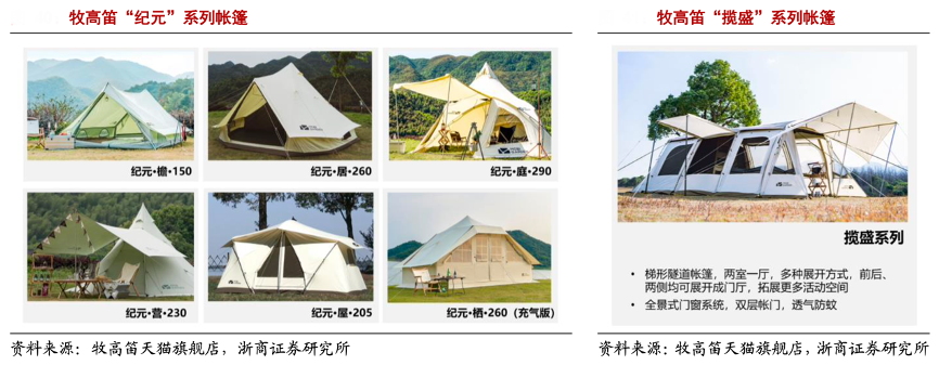 經(jīng)典案例:根據(jù)牧高笛天貓旗艦店、浙商證券研究所等綜合資訊表明,牧高笛公司于 2020 年推出“紀(jì)元”系列,定位高端精致露營市場,相比于傳統(tǒng)戶外帳篷,紀(jì)元系列帳篷內(nèi)部空間大幅擴(kuò)大,高度達(dá)到 1.8-2.9 米,可以展開前廳,使用者可以在帳篷內(nèi)烹飪,契合精致露營場景的獨(dú)特需求。2021 年公司推出“攬盛”梯形隧道帳篷,活動空間更大且利用率高,上市后始終占據(jù)銷量前列,多次追加補(bǔ)單,成為公司另一大爆款產(chǎn)品。