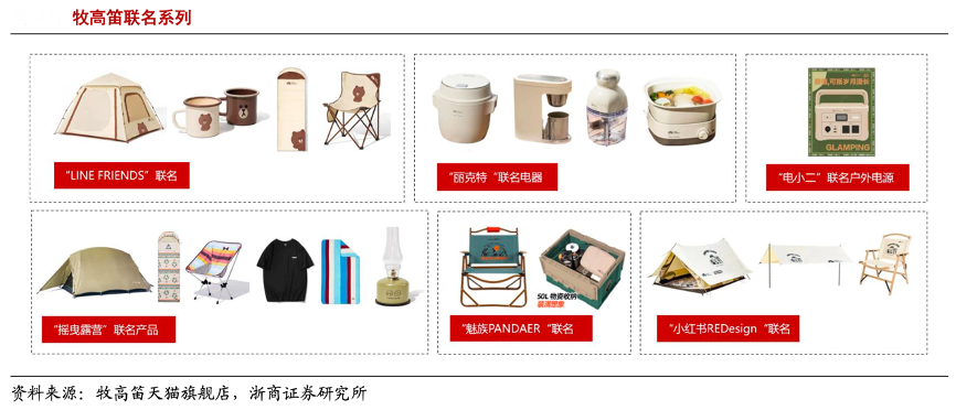 經(jīng)典案例:根據(jù)牧高笛天貓旗艦店、浙商證券研究所等綜合資訊表明,中國露營市場正 從“專業(yè)性能”向“時尚精致”轉(zhuǎn)變,牧高笛公司于 2021 年推出 Line Friends 聯(lián)名系列,打破傳統(tǒng)帳篷單調(diào)沉悶的形象,瞄準(zhǔn)親子、女性、年輕人客群,該聯(lián)名系列同時還包括天幕、拖車、睡袋、折疊椅、野餐墊等配套產(chǎn)品,目前已占大牧銷售額約10%。此外,公司還與魅族 PANDAER、搖曳露營、麗克特、電小二、小紅書等與自身品牌調(diào)性契合的品牌/IP 聯(lián)名推出系列產(chǎn)品,以快速觸及新用戶,提升品牌知名度。
