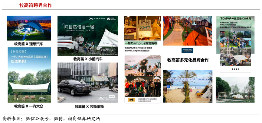 經(jīng)典案例:根據(jù)微信公眾號(hào)、微博、浙商證券研究所等綜合資訊表明,牧高笛近年開展的跨界合作主要包括:1)贊助專業(yè)隊(duì)伍:贊助北大山鷹社徒步中國(guó)南極科考、徒步加拿大洛基山脈等,強(qiáng)化“露營(yíng)專業(yè)主義”品牌形象;2)汽車品牌合作:與理想、小鵬、勞斯萊斯、奔馳等高端車企合作舉辦露營(yíng)活動(dòng),直接觸達(dá)精致露營(yíng)目標(biāo)客群,同時(shí)加深高端、精致的品牌形象等。