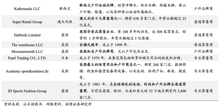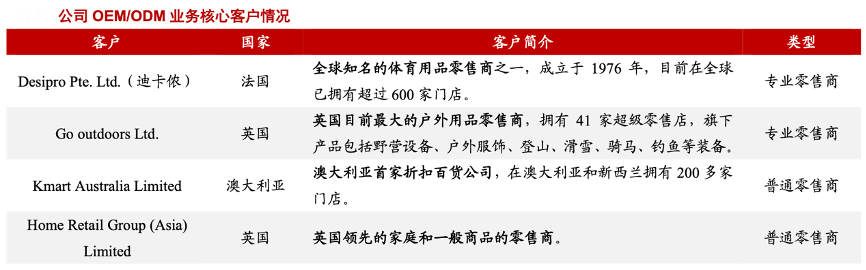 經(jīng)典案例:根據(jù)公司招股書、網(wǎng)絡(luò)資料、浙商證券研究所等綜合資訊表明,除了迪卡儂外,牧高笛其他核心客戶也均為全球優(yōu)質(zhì)的零售商或品牌商。縱觀牧高笛公司 30 多家 客戶,大致可分為三類:1)普通的綜合性零售商:如澳大利亞的 Kmart、Super Retail, 英國(guó)的 Home Retail等;2)專業(yè)戶外用品零售商:如英國(guó)最大的戶外零售商 Go outdoors、美國(guó)最大的體育戶外用品商店 Academy;3)戶外用品品牌商:如新西蘭的 Kathmandu、美國(guó)的Mountainsmith 等。