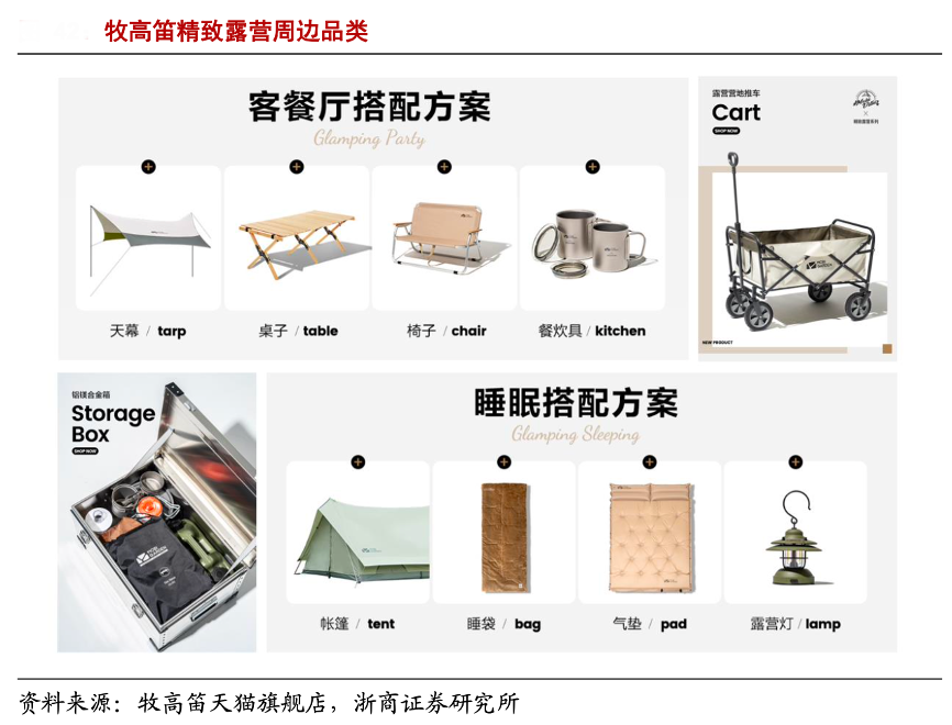 經典案例:根據牧高笛天貓旗艦店、浙商證券研究所等綜合資訊表明,牧高笛公司于 2020 年推出“紀元”系列,定位高端精致露營市場,相比于傳統戶外帳篷,紀元系列帳篷內部空間大幅擴大,高度達到 1.8-2.9 米,可以展開前廳,使用者可以在帳篷內烹飪,契合精致露營場景的獨特需求。