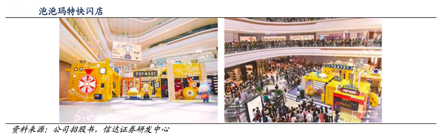 經(jīng)典案例:根據(jù)公司招股書、信達(dá)證券研發(fā)中心等綜合資訊表明,泡泡瑪特公司通過與購物中心合作,推出限時主題的快閃店,快閃店形式多樣化且一般位于商場較為顯眼位置,創(chuàng)造浸入式的購物體驗并且提升品牌知名度。快閃店的期限一般為 1~3 個月。