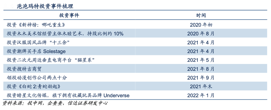 經(jīng)典案例:根據(jù)投中網(wǎng)、企查查、信達(dá)證券研發(fā)中心等綜合資訊表明,泡泡瑪特公司對動漫、國風(fēng)潮牌、潮玩品牌等領(lǐng)域投資,在參投兩部優(yōu)秀國內(nèi)動漫電影《新神榜:哪吒重生》、《白蛇 2: 青蛇劫起》后,公司推出了相應(yīng)IP 的潮玩盲盒。21 年 4 月、22 年 1 月,公司分別投資潮 牌買手店 Solestage、暗星文化傳媒(旗下?lián)碛惺詹赝婢咂放?nbsp;Underverse),產(chǎn)生業(yè)務(wù)戰(zhàn)略聯(lián)動。