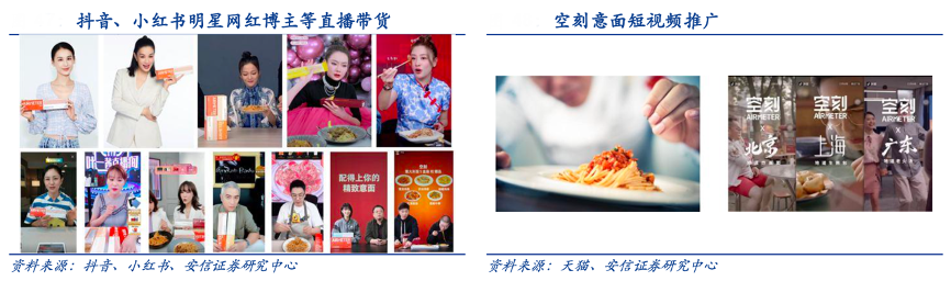 經(jīng)典案例:根據(jù)抖音、小紅書、天貓、安信證券研究中心等綜合資訊表明,空刻借“一人食”的火熱趨勢(shì),瞄準(zhǔn)新銳白領(lǐng)、資深中產(chǎn)、精致寶媽等目標(biāo)人群,通過“星級(jí)意面在家做”這一 充滿氛圍感的品牌占位直擊受眾的情感訴求,掀起了速食意面的消費(fèi)熱潮。同時(shí),針對(duì)快消品的特征,空刻在抖音、小紅書、微博等均投放大量軟廣,不斷教育消費(fèi)者,亦通過頭部主播進(jìn)行讓利推廣。