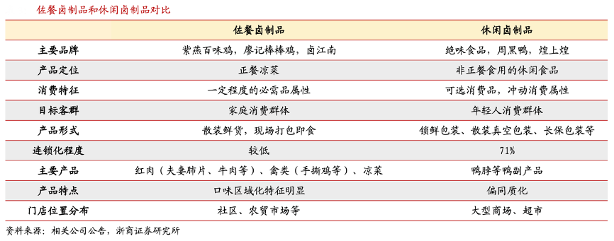 經典案例:根據相關公司公告、浙商證券研究所等綜合資訊表明,鹵制品按消費場景可劃分為佐餐鹵味和休閑鹵味。佐餐鹵制食品主要指在家庭以及餐廳、酒店等餐桌消費場景食用的食品,休閑鹵制食品主要是指在閑暇時享用的鴨脖、鴨爪等鹵制食品,即在正餐之間、社交以及體育活動等場景作為零食享用的食品。因產品屬性、消費客群及消費場景的差異,兩種鹵味生意在選址時各有側重。