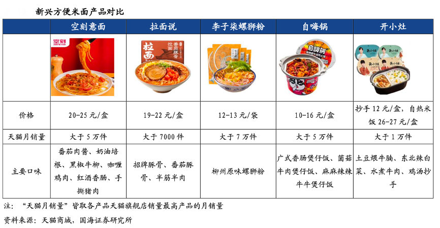 經典案例:根據天貓商城、國海證券研究院等綜合資訊表明,輕烹食品出現了升級變化,除了為人們熟知的方便面、方便米粉、速凍水餃、微波菜肴之外,自熱小火鍋、自熱米飯、意面等輕烹食品新品類不斷涌現。空刻意面與拉面說,李子柒螺螄粉、自嗨鍋等產品相比,定價和定位相對高端,從天貓旗艦店的銷售情況來看也排名靠前。