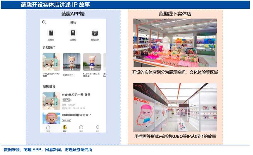 經典案例:根據葩趣APP、網易新聞、財通證券研究所等綜合資訊表明,葩趣于 2022 年 1 月 在上海徐匯美羅城開設葩趣旗艦店,增加 IP 的曝光后再依托泡泡瑪特的供應鏈,打造 IP 衍生品,最后在葩趣線下門店、小程序以及天貓旗艦店等渠道售賣,建立完整的 IP 打造鏈條。目前,葩趣已經簽約 KUBO 和焦綠貓兩大 IP,并擁有眾多粉絲。其中 KUBO 被稱為 2021 年潮玩的最大黑馬,在小紅書上有超 8000 篇相關筆記內容。