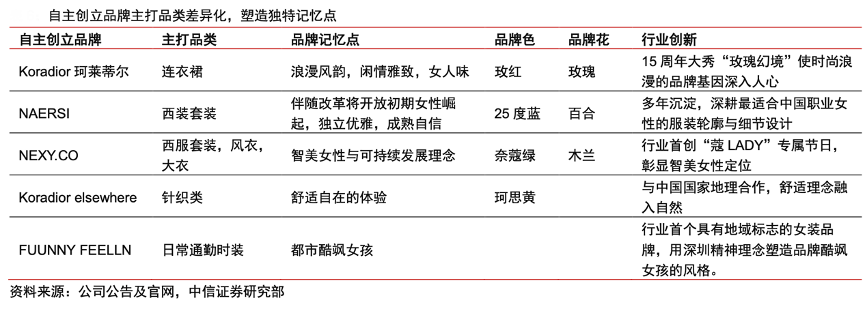 經典案例:根據公司公告及官網、中信證券研究部等綜合資訊表明,以三大核心品牌為例,贏家時尚公司賦予各品牌代表色,例如珂萊蒂爾玫紅、娜爾思 25 度藍、奈蔻綠、珂思黃,并在產品設計上融入玫瑰、百合、蘭花等品牌花賦予品牌差異化內涵。