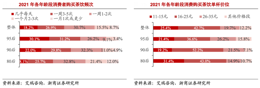 經典案例:根據艾瑞咨詢、浙商證券研究所等綜合資訊表明,年輕一代是新茶飲消費主力,且對高價格帶產品接受度更高。根據艾瑞咨詢,從 2021年各年齡段消費者購買茶飲頻次分布數據來看,年輕群體消費茶飲的頻次更高,以 95 后為例,30.1%的 95 后消費者幾乎每天購買茶飲,31.2%的 95 后一周購買茶飲 3-5 次。另外,從茶飲單杯價位來看,95后選購26-35元價格帶的比例最高,達到26.2%。