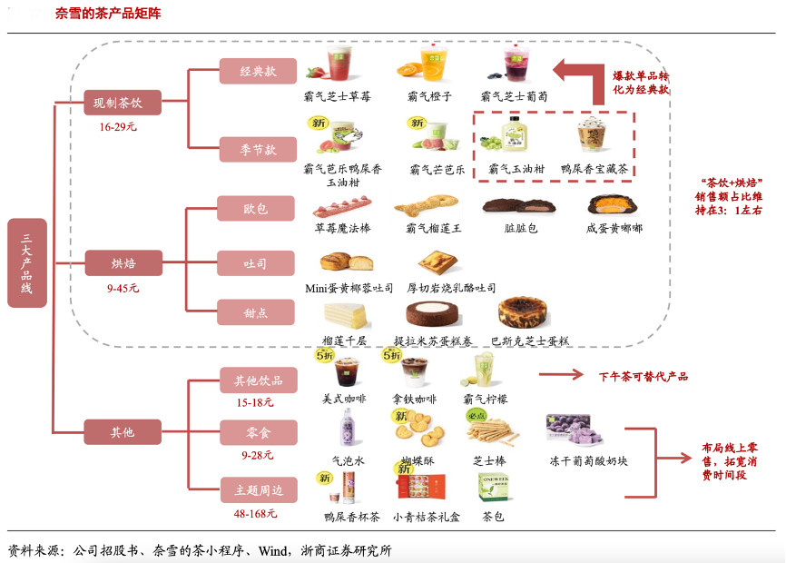 經典案例:根據公司招股書、奈雪的茶小程序、wind、浙商證券研究所等綜合資訊表明,奈雪產品矩陣豐富,上新節奏較快。從產品矩陣來看,奈雪的產品主要包括茶飲、烘焙和其他產品。產品上新節奏方面,根據奈雪發布的《2021 年大數據報告》,2021年奈雪共上新 105 款產品,其中包括 42 款飲品、37 款烘焙和 26 款零食產品,飲品/烘焙/零售的月均上新分別為 3.5/3.1/2.2 款,上新速度處于較快水平。