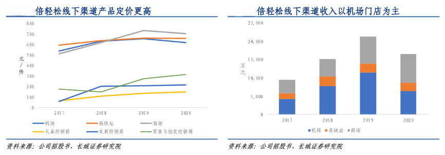 經典案例:根據公司招股書、長城證券研究院等綜合資訊表明,倍輕松公司直營門店聚集于客流量較大的機場、高鐵站以及一二線城市核心商圈。截至 2021 年 6 月 30 日,公司商場門店覆蓋了全國 4 個一線城市、13 個新一線城市、16 個二線城市。高客流消費力匹配公司高端產品定價。2017-2020年公司直營門店價格普遍在 500-700 元,遠高于線上線下經銷渠道 100-300 元的產品價格區間。