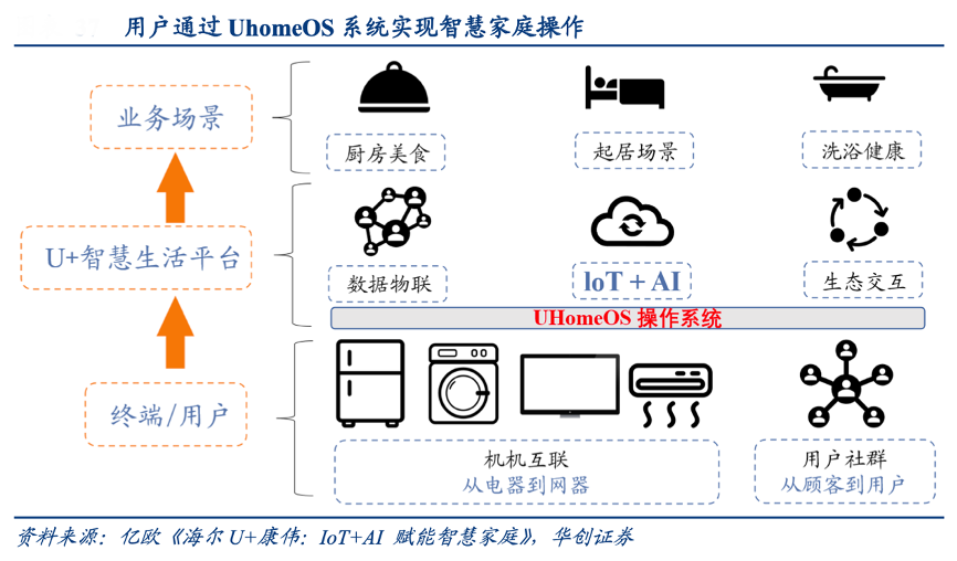 經(jīng)典案例:根據(jù)億歐《海爾U+康偉:IOT+AI賦能智慧家庭》、華創(chuàng)證券等綜合資訊表明,UhomeOS 發(fā)布于2016 年,是海爾專為智慧家庭定制的生態(tài)操作系統(tǒng), 涵蓋臥室起居、廚房美食、浴室洗護(hù)等多個場景,可以通過 UhomeOS 系統(tǒng)把用戶、家電、服務(wù)三者串聯(lián)起來,提供全屋智能落地方案。