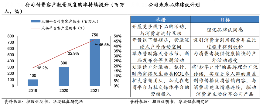 經典案例:根據(jù)招股說明書、華安證券研究所等綜合資訊表明,蕉下公司營銷體系覆蓋線上線下,構建了覆蓋天貓、抖音、小紅書等線上平臺營銷矩陣,而線下門店負責提供戶外產品使用教育、選購建議與直接購物體驗。根據(jù)灼識咨詢,公司消費者滿意度在國內防曬服品牌中排名第一,且 70%客戶在購買后會向別人分享購買經歷。公司 2019-2021 天貓旗艦店付費客戶數(shù)分別為 100/300/750 萬人,復購率分別為 18.2%/32.9%/46.5%,忠實消費者數(shù)量逐漸增加。