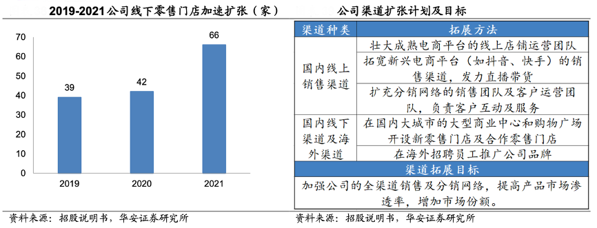 經典案例:根據(jù)招股說明書、華安證券研究所等綜合資訊表明,作為 DTC 品牌,蕉下公司通過營銷完成品牌的出圈,其線下零售門店數(shù)由 2019 年末的 39 家 增加至 2021 年末的 66 家。在線下渠道加速擴張下,公司線下的營收逐漸增加,2019-2021年線下收入分別為 3.12/3.18/6.58 億,CAGR 達45.2%。