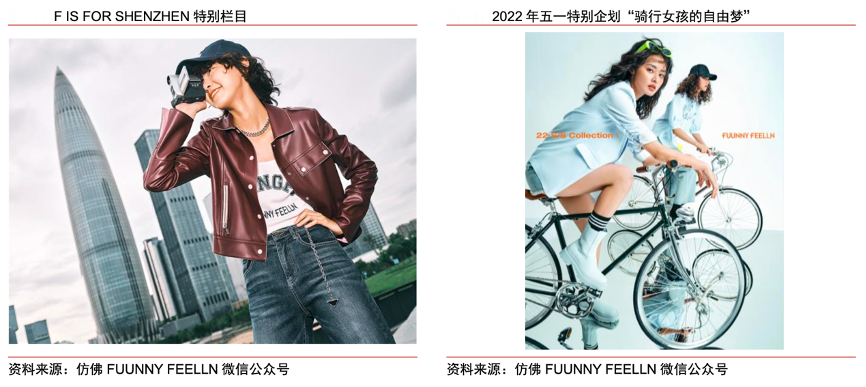 經典案例:根據FUUNNY FEELLN微信公眾號、中信證券研究部等綜合資訊表明,FUUNNY FEELLN仿佛:融入深圳地域標志,打造都市通勤標簽,塑造酷颯女孩風格。仿佛定位為中淑人群,聚焦未來女性的生活方式,主張把“新鮮的,趣味的設計元素”融入日常通勤時裝。2022 年推出 F IS FOR SHENZHEN 特別欄目,探尋深圳城市文化、仿佛品牌以及當代酷颯女孩的共鳴與連接,傳遞“獨立、現代、自由、夢想”的品牌精神。