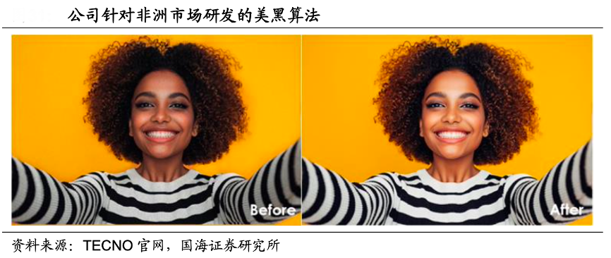 經典案例:根據TECNO官網、國海證券研究所等綜合資訊表明,傳音控股主打高性價比,注重客戶需求和體驗,針對拍照、上網、充電等進行深度本地化優化,不斷加大研發投入解決用戶痛點。2020 年-2022 年前三季,公司研發投入同比增速保持在 30%以上,期間已經累計投入超過 40 億元,并針對非洲市場開發了深膚色拍照、硬件定制化、防水防侵蝕、大電流快充等技術。