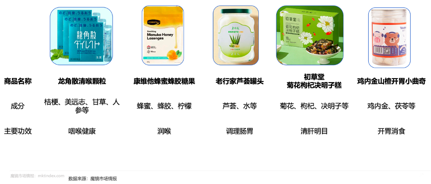 經(jīng)典案例:根據(jù)魔鏡市場情報等綜合資訊表明,國內(nèi)外品牌均對產(chǎn)品形態(tài)的豐富上各有創(chuàng)新,壓片糖果、顆粒等形態(tài)易于服用且便于攜帶,餅干將通過口味調(diào)和來迎合兒童市場的需求。蘆薈即食罐頭和黃精露雖都是單一配方藥食同源產(chǎn)品,產(chǎn)品形態(tài)的改變將會給消費(fèi)者一種新鮮感,食用也更加便捷。而不少養(yǎng)生茶的配方以糕點(diǎn)形態(tài)重新面世,消費(fèi)人群拓寬,保溫杯將不再是養(yǎng)生茶的忠實(shí)伴侶。