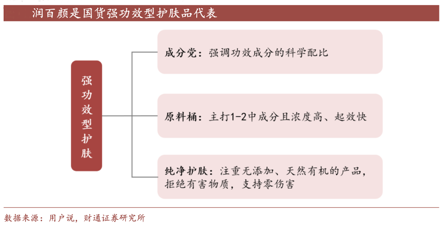 經典案例:根據用戶說、財通證券研究所等綜合資訊表明,主打單一成分的強功效護膚產品市場規模預計從2019 年的 120 億元提升至 2024 年的 362 億 元。在玻尿酸高熱度的背景下,潤百顏以“玻尿酸”為核心,搭配二裂酵母等網紅產 品構建強功效護膚產品,以“玻尿酸大廠”研發實力背書,迅速占領消費者心智。