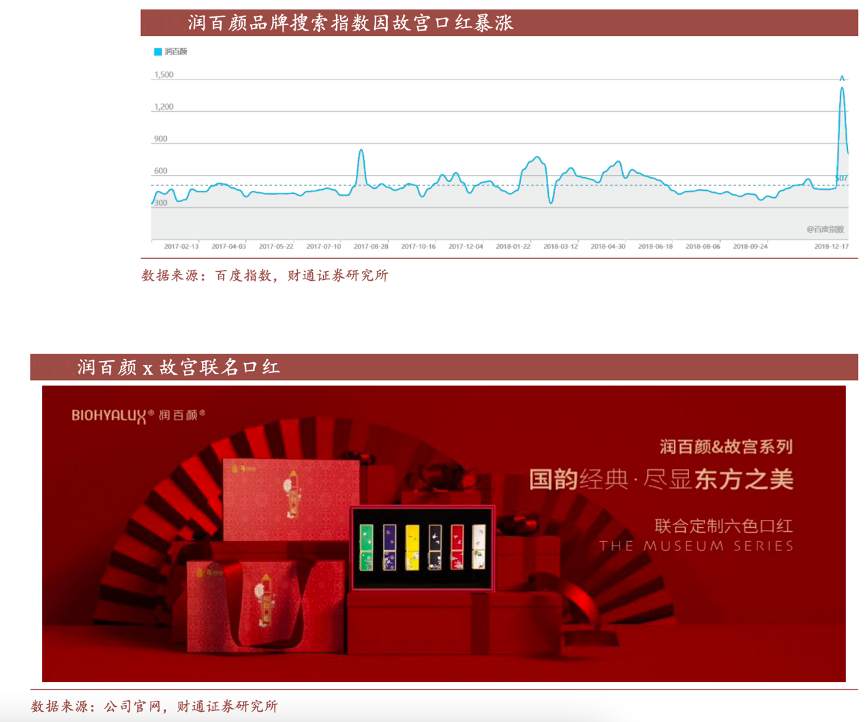 經典案例:根據百度指數、公司官網、財通證券研究所等綜合資訊表明,2018 年 12 月 9 日潤百顏聯合故宮博物院發布新品故宮口紅,僅一天預定數已經超 過一千支,其中最火的“朗窯紅”色號目前預定數已超過600支。“故宮口紅”的爆火,對潤百顏品牌影響力即刻產生了積極反饋,第二天潤百顏品牌搜索 指數飆升至 1422,創造了品牌自成立到當時的最高熱度。