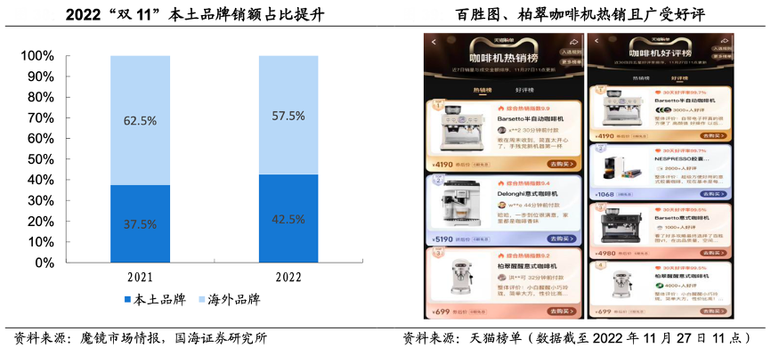經典案例:根據魔鏡市場情報、天貓榜單、國海證券研究所等綜合資訊表明,從我國咖啡機銷售表現來看,德龍、奈斯派索、飛利浦等中高端海外品牌占據市場主流,結合魔鏡市場數據(淘寶天貓數據),2022M6 德龍咖啡機銷額 10726 萬元(同 比+126%),“雙 11”銷額 9663 萬元。百勝圖、柏翠等高性價比的本土品牌增 長亮眼,百勝圖咖啡機 2022M6 銷額 2479 萬元(同比+605%),“雙 11”銷額 3584 萬元達到 top2。