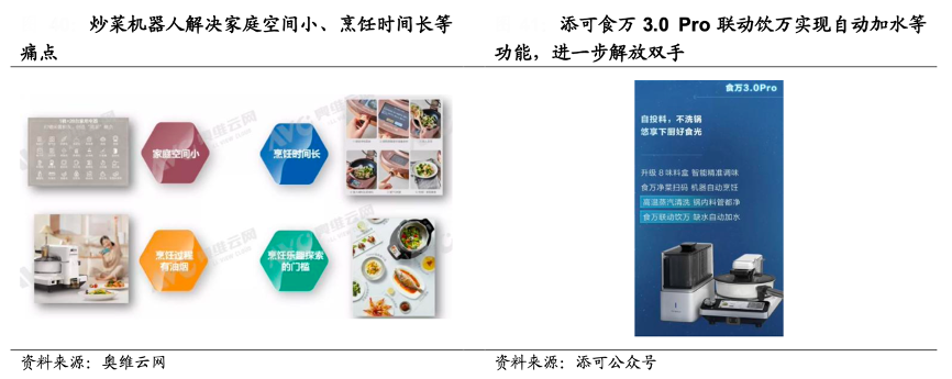 經典案例:根據奧維云網、添可公眾號、國海證券研究所等綜合資訊表明,從產品創新來看,炒菜機器人解決了家庭空間小、烹飪時間長等痛點,添可食萬3.0 Pro 聯動飲萬實現自動加水等功能,進一步解放雙手。
