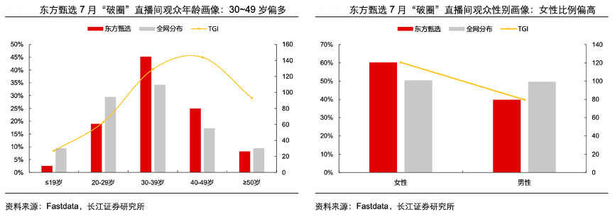 經典案例:根據Fastdata、長江證券研究所等綜合資訊表明,東方甄選直播間吸引了較多中年女性觀眾,這些觀眾不僅是上述情緒氛圍的消費者,而且普遍關心子女教育,新東方在教育領域的口碑得以有效變現。Fastdata 對東方甄選的用戶畫像數據顯示,對比全網分布,東方甄選 30 歲~49 歲觀眾占總數的70%,較全網分布比例高出19 pct,女性觀眾占比 60%,較全網分布比例高出 10 pct。