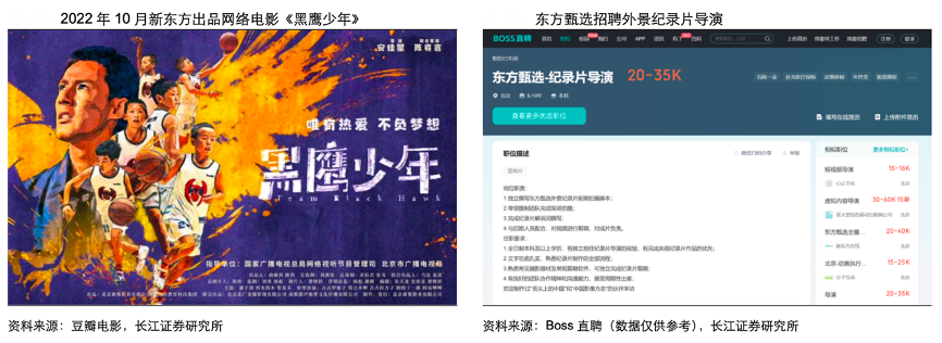 經典案例:根據豆瓣電影、Boss直聘、長江證券研究所等綜合資訊表明,除了直播間中一系列嘉賓做客、外景直播內容,新東方集團已作為出品人于2022年 10 月全網上線電影《黑鷹少年》,并通過 11 月新開的“東方甄選看世界”抖音號持續創作人文旅游內容。