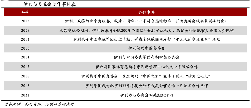 經(jīng)典案例:根據(jù)公司官網(wǎng)、萬聯(lián)證券研究所等綜合資訊表明,以龍頭伊利股份為例,從2005年與北京奧組委簽約開始,伊利逐漸成為奧運會、殘奧會等運動賽事的忠實合作伙伴。