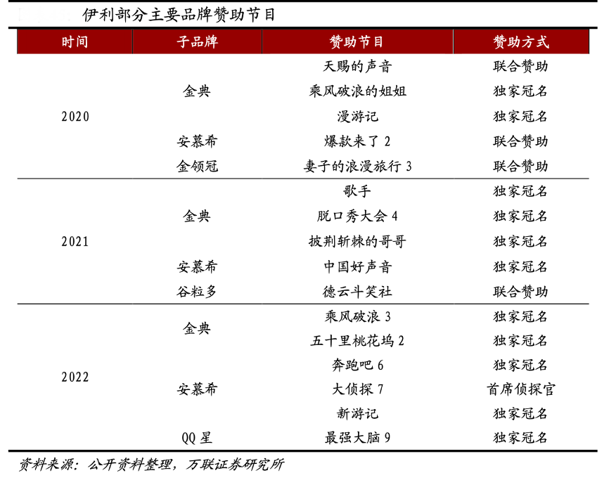 經(jīng)典案例:根據(jù)公司資料、萬聯(lián)證券研究所等綜合資訊表明,伊利獨家冠名10家節(jié)目以上,奔跑吧兄弟、中國好聲音等一系列綜藝節(jié)目的火爆為伊利品牌的推廣起到了巨大的推進(jìn)作用。通過賽事、綜藝等品牌宣傳活動,品牌商進(jìn)一步提升了品牌形象與知名度,培育終端消費者心智,助力品牌傳播。