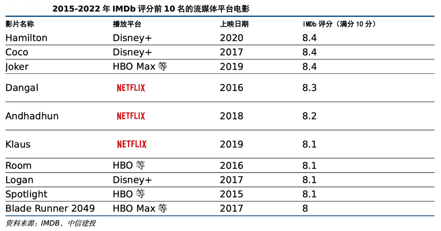經(jīng)典案例:根據(jù)IMDB、中信建投等綜合資訊表明,電影專業(yè)評分平臺 IMDb 數(shù)據(jù)顯示:2015至2022年間評分位居前十的流媒體電影中,Netflix 擁有其中 3 部影片的獨(dú)家播放權(quán),成為擁有最多上榜影片的流媒體平臺之一。專業(yè)獎項(xiàng)上,Netflix 在艾美獎評選中斬獲的提名和獎項(xiàng)數(shù)量整體呈現(xiàn)增長趨勢;在 2022 年學(xué)院獎評選中,Netflix 在與眾多傳統(tǒng)電影制作商和新興流媒體平臺的競爭中斬獲了最多獎項(xiàng)。