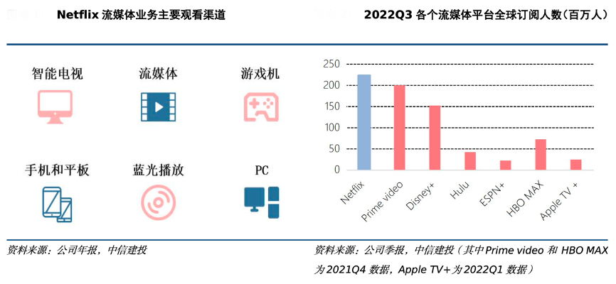 經(jīng)典案例:根據(jù)公司年報(bào)、公司季報(bào)、中信建投等綜合資訊表明,奈飛主要營收來源是訂閱制的包月服務(wù)費(fèi),其流媒體服務(wù)營收占比已經(jīng)超過 99%,公司通過移動應(yīng)用程序、網(wǎng)站、電視軟件、 游戲平臺及 DVD 郵寄等內(nèi)容分發(fā)渠道觸及其客戶,截至 2022Q3 已經(jīng)在全球超過 190 個國家擁有超過 2.2 億付費(fèi)訂閱用戶,穩(wěn)居北美流媒體市場第一位。