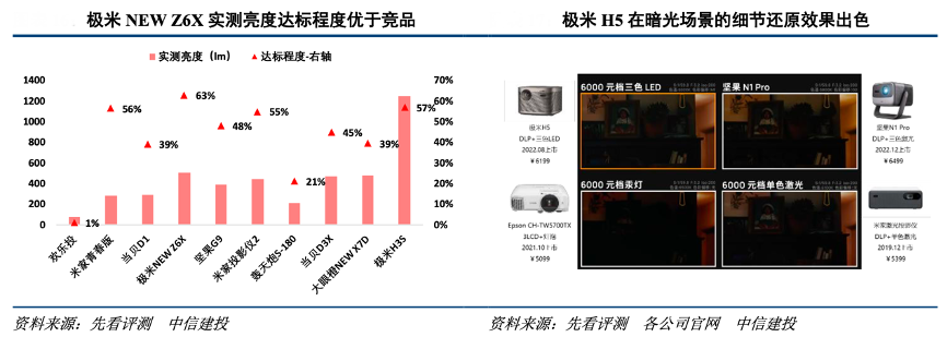 經(jīng)典案例:根據(jù)先看評測、各公司官網(wǎng)、中信建投等綜合資訊表明,對比同價位、其他技術(shù)路徑投影儀,極米LED 產(chǎn)品畫質(zhì) 表現(xiàn)更均衡,并且有出色系統(tǒng)加持。經(jīng)過實測,極米 NEW Z6X(0.33”DMD 顯示芯片)的實測亮度高于大眼 橙 NEW X7D(0.47”DMD顯示芯片);極米 H5(三色 LED)的暗光場景表現(xiàn)媲美堅果 N1 Pro(三色激光)。此外,極米自主開發(fā)的 GMUI 系統(tǒng)流暢度出眾,為消費者提供更好的投影儀使用體驗。