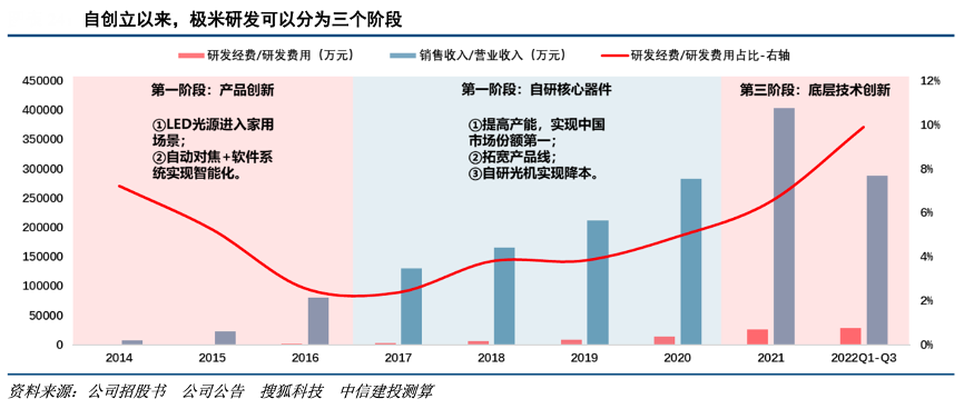 經(jīng)典案例:根據(jù)公司招股書、公司公告、搜狐科技、中信建投等綜合資訊表明,自 2013 年創(chuàng)立以來,極米的研發(fā)歷程可以分成三個階段。其從開創(chuàng)家用智能投影品類,到實現(xiàn)中國市場份額第一、自研光機導(dǎo)入量產(chǎn),此前研發(fā)階段的既定目標已經(jīng)完成,而今加強底層技術(shù)創(chuàng)新,繼續(xù)引領(lǐng)行業(yè)發(fā)展。