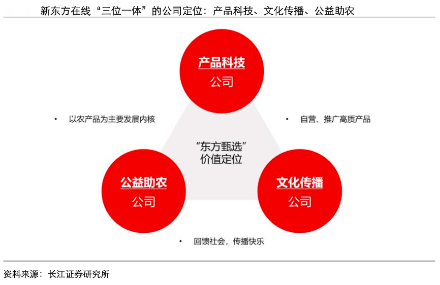 經典案例:根據長江證券研究所等綜合資訊表明,從東方甄選管理層最近公開表述的公司定位中可以發現,“產品與科技公司—文化傳播公司—公益助農公司”三位一體,深化品牌內涵被放在了戰略級高度。