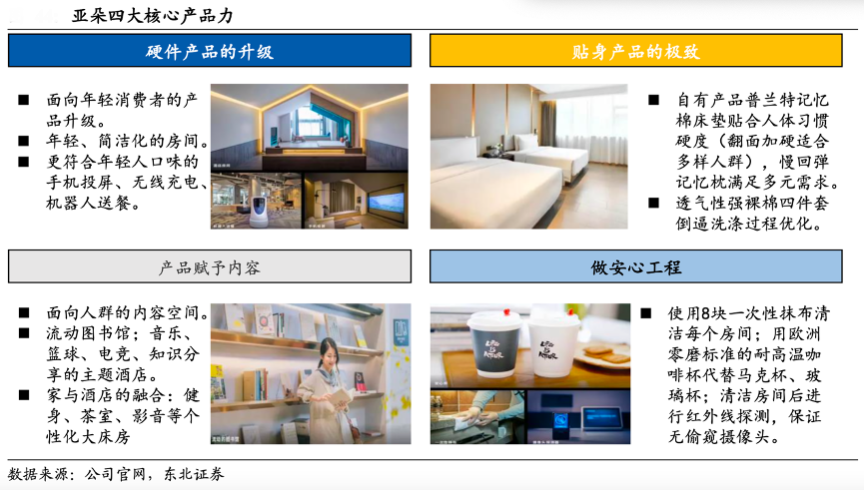 經典案例:根據公司官網、東北證券等綜合資訊表明,亞朵始終將高品質作為酒店競爭力的基礎,在產品硬件上基于年輕一代的需求進行升級,房間裝修更符合年輕化、簡潔的特征,同時通過手機投屏、無線充電等智能設備提升住宿體驗;更以“看得見”的優質貼身產品提升顧客睡眠體驗,通過可翻轉具有雙面硬度的普蘭特記憶棉床墊、支撐力較強的慢回彈記憶枕、透氣性強且高衛生標準的四件套等床品保障顧客的睡眠質量。