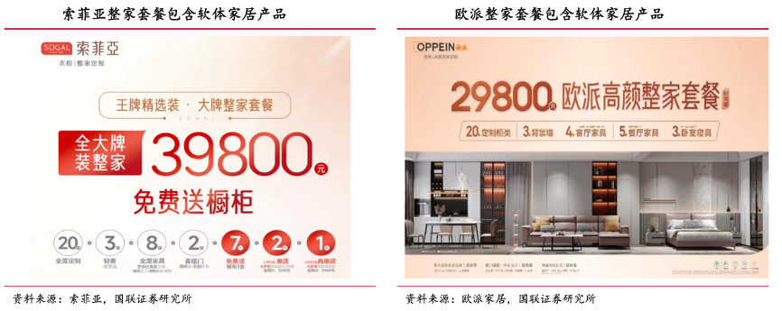 經(jīng)典案例:根據(jù)索菲亞、歐派家居、國聯(lián)證券研究所等綜合資訊表明,歐派、索菲亞等進(jìn)軍整家領(lǐng)域,對(duì)軟體成品企業(yè)造成部分沖擊。歐派衣柜事業(yè)部 2021 年推出的 29800 元整家套餐,除了包含 20 平米的價(jià)值 19800 元的定制柜子外, 還包含 10 件價(jià)值為 10000 元的軟體成品家具,軟體產(chǎn)品以接近成本價(jià)出售。