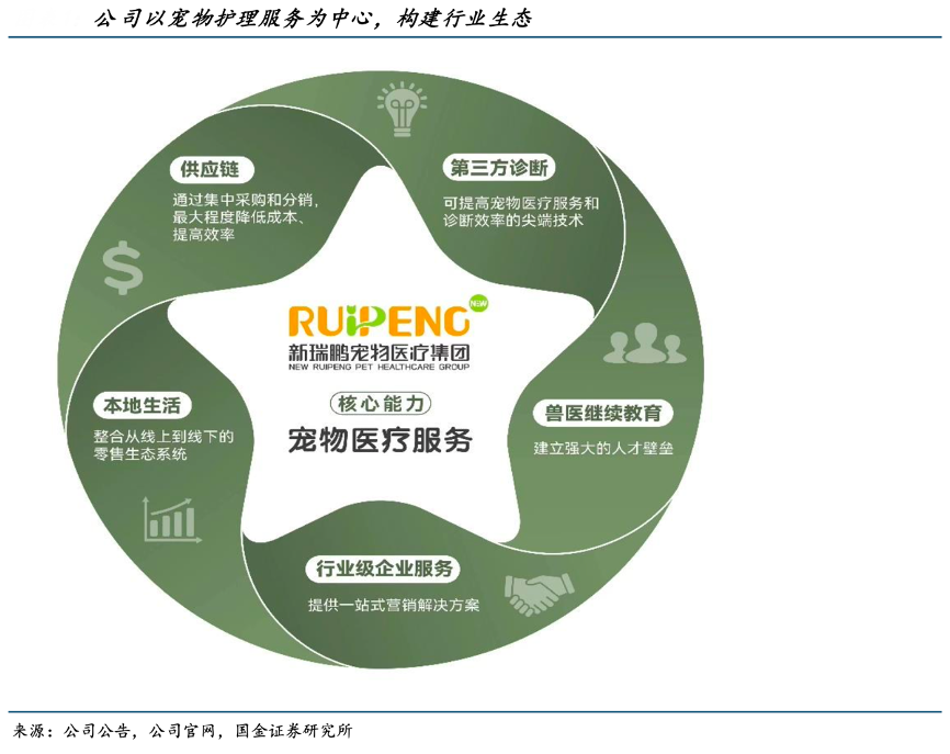 經典案例:根據公司公告、公司官網和國金證券研究所等綜合資訊表明,新瑞鵬已經成為國內寵物護理龍頭,截至 2021 底,擁有 23 個寵物醫院 品牌&1887 家寵物醫院,約為國內排名第 2~10 名競爭對手寵物醫院總數的 3 倍,在國內一線城市的寵物護理市場份額 約為 30%。截至 2022Q3,公司在國內寵物醫院數量進一步增加至1942 家。當前以寵物護理服務、供應鏈服務和本地服務為三大支柱,并已擴展到第三方診斷、繼續獸醫教育其他業務領域。