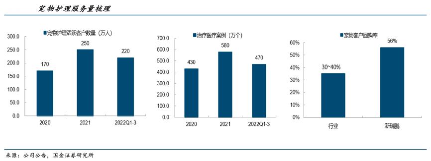 經典案例:根據公司公告、國金證券研究所等綜合資訊表明,2020、2021、2022Q1-3,新瑞鵬公司寵物護理活躍客戶數量分別為 170 萬人、250萬人、220 萬人,分別治療約 430 萬、580 萬及 470 萬宗醫療個案。2021年寵物客戶回購率約56% (行業平均水平為 30%~40%)。