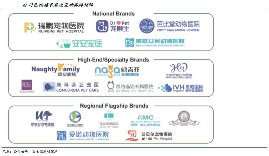 經典案例:根據公司公告、國金證券研究所等綜合資訊表明,截至 2021 年底,新瑞鵬公司擁有 23 個寵物醫院品牌,其中國內醫院數量排名前 20 的品牌中有 13 個。品牌家族分為三個層次:1)全國品牌,具備全國影響力和綜合能力;2)區域 旗艦品牌,即所在省市的主要寵物醫院;3)高端/專業品牌,迎合寵物父母的不同需求和消費水平。