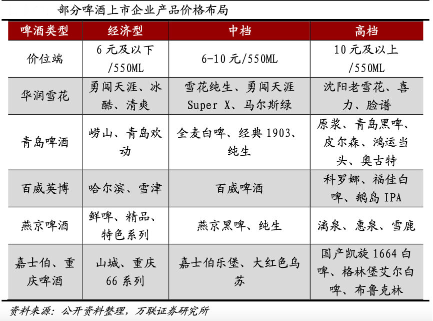 經典案例:根據公開資料、萬聯證券研究所等綜合資訊表明,在保持原有產品的基礎上,酒企積極布局中高端酒市場,在啤酒存量競爭的情況下,精釀啤酒、預調酒等多元化的低度酒飲逐漸獲得企業的重視與開發。如華潤啤酒在高端酒布局方面打造“4+4”高端品牌矩陣,包括雪花旗下的勇闖天涯 SuperX、馬爾斯綠、匠心營造、臉譜以及喜力旗下的喜力星銀、虎牌、紅爵、 蘇爾。燕京啤酒則以“燕京”為主品牌,打造漓泉、惠泉、雪鹿3個區域優勢的高端品牌的“1+3”戰略。