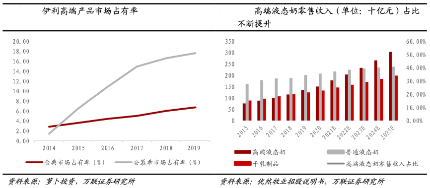 經典案例:根據蘿卜投資、優然牧業招股說明書、萬聯證券研究所等綜合資訊表明,傳統產品的競爭多集中于促銷、價格戰的方式,而高端產品系列的競爭以口味、功能和工藝等方面的升級為主。金典與安慕希作為伊利在常溫液態奶與酸奶市場的主打高端品牌,近年來在飲用奶市場的占有率持續上升:2014-2019年,金典與安慕希市占率分別提升由2.8%、1.4%提升至6.7%、17.6%。
